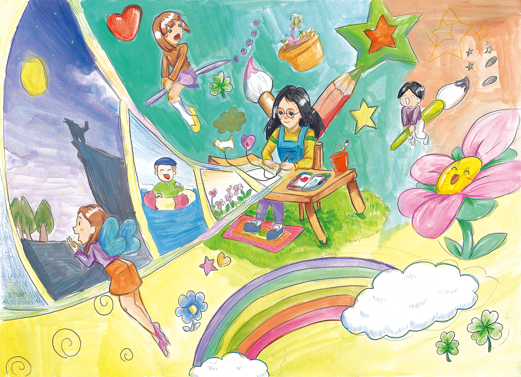 "나는 내가 그리고 싶은 그림을 뚝딱 그려내는 힘이 있어서 내가 그림 그리는 것을 그렸다. 또 나는 내 그림들로 사람들을 행복하게 해주고 싶어서 옆에 내 그림을 보고 웃고 있는 사람들도 그렸다. 나의 슈퍼파워는 그림이다!"
