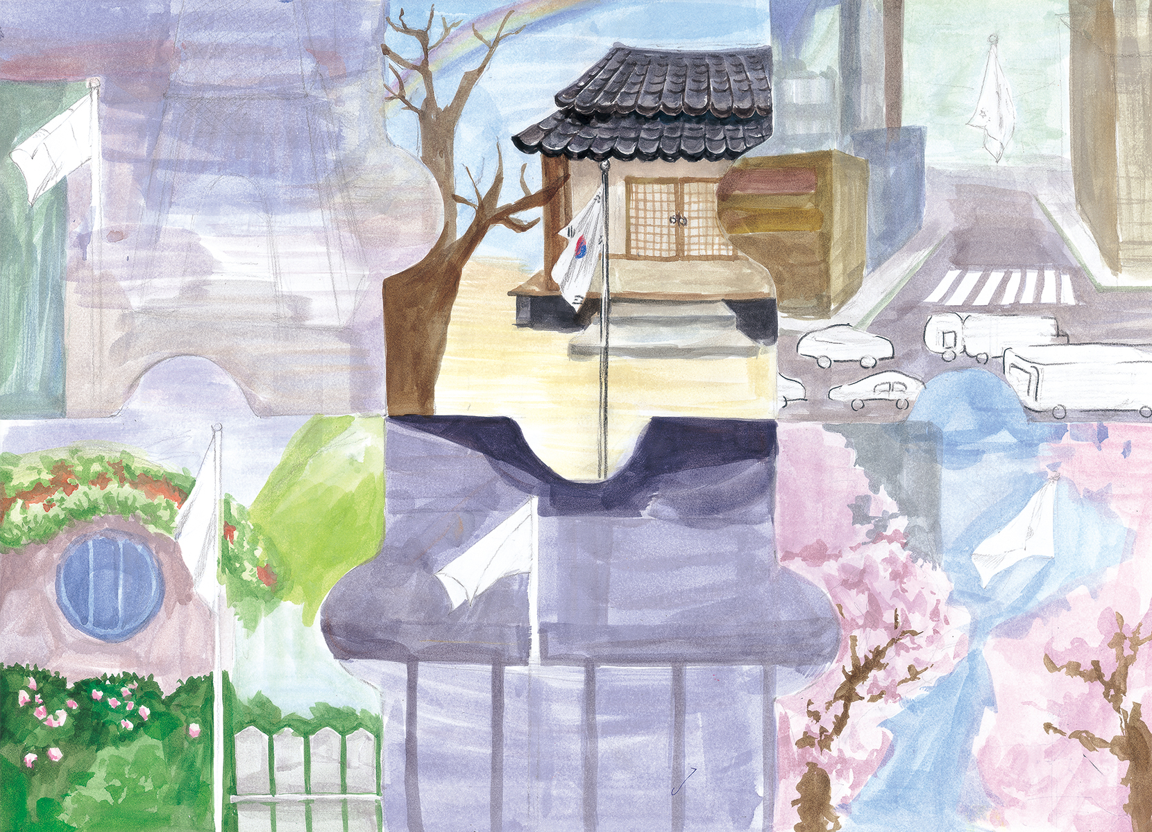 다른 나라들이지만 서로 연결되어있는 퍼즐로 표현해서 세계속에서 따로 있지만, 또 함께라는 주제를 드러내었다.
