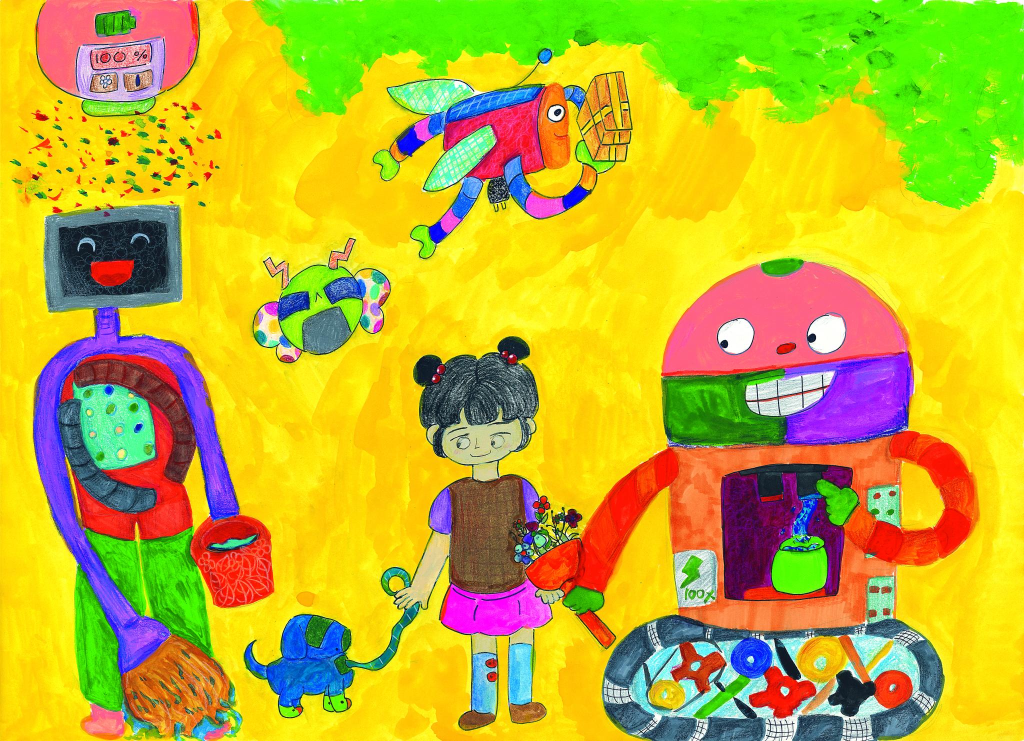 앞으로 우리가 살아갈 세상은 AI 로봇과 사람이 서로 도움을 주고받으며 함께 살아가야 합니다. 그래서 저는 로봇과 사람이 함께 하는 모습을 그려보았습니다.