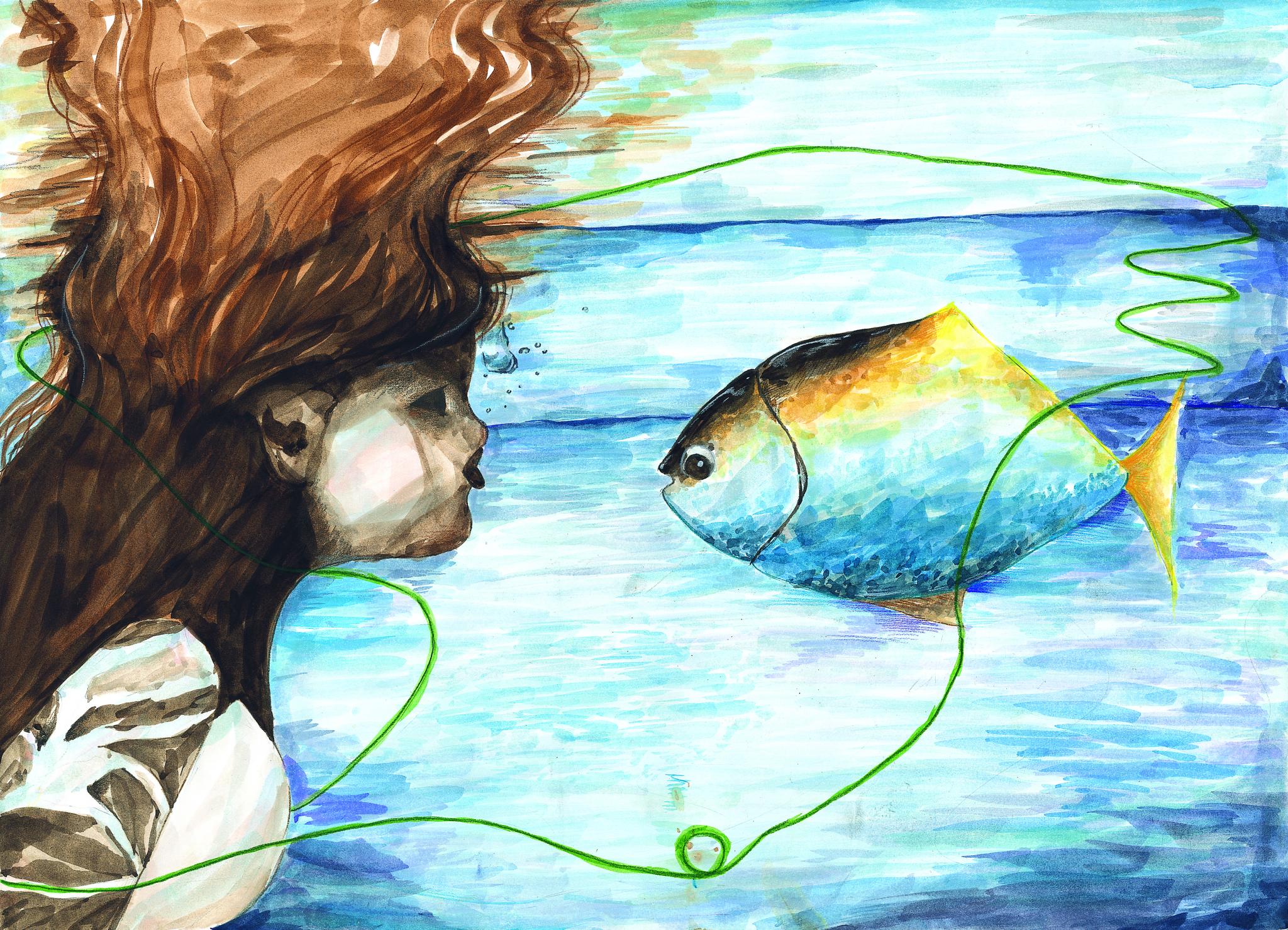 주제를 보자마자 떠오른 것이 지구상에 있는 생명체였다. 우리는 모습은 달라도 서로 어우러져 살아가고 있다. 그것을 표현하기 위해 지구에 있는 물, 사람, 동물, 식물을 그렸다. 지구에 많은 비율을 차지하고 있는 물을 배경으로 하고, 사람과 동물이 뽀뽀하려고 하는 모습을 그린다음 식물 줄기를 이용해 우리는 하나다라는 것을 표현하기 위해 둘러감았다.