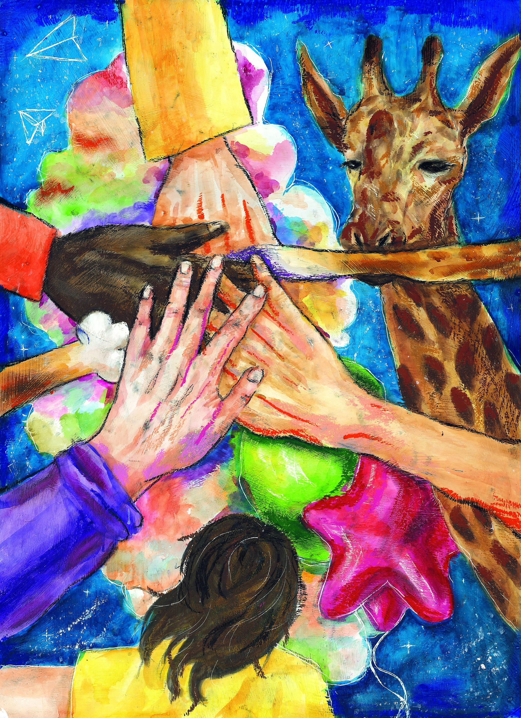 저는 사람끼리 어울리는 것 뿐만 아니라, 다양한 종족 즉, 동물과 사람도 서로 어울려 사는 세상을 표현해 보았습니다. 각자 생김새, 처음 뻗어온 방향은 다를지라도 결국 모두의 손이 모이는 곳은 한 곳인 모습을 그렸습니다.