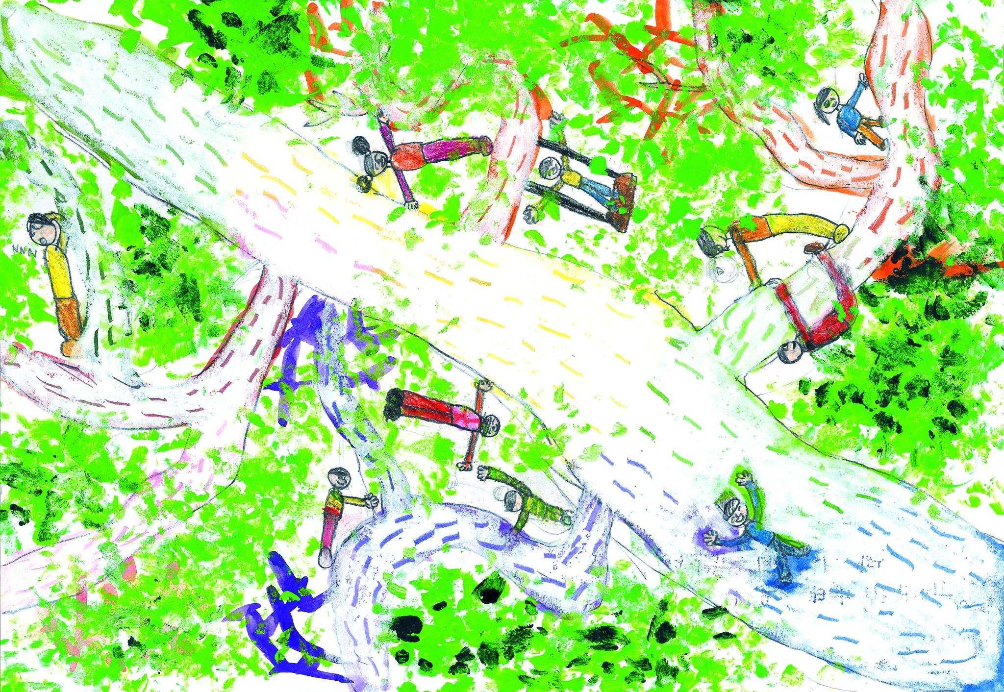 나무와 여러 명의 친구들이 놀고 있어요. 그네 타는 친구, 나무 타는 친구, 나는 친구가 있어요.