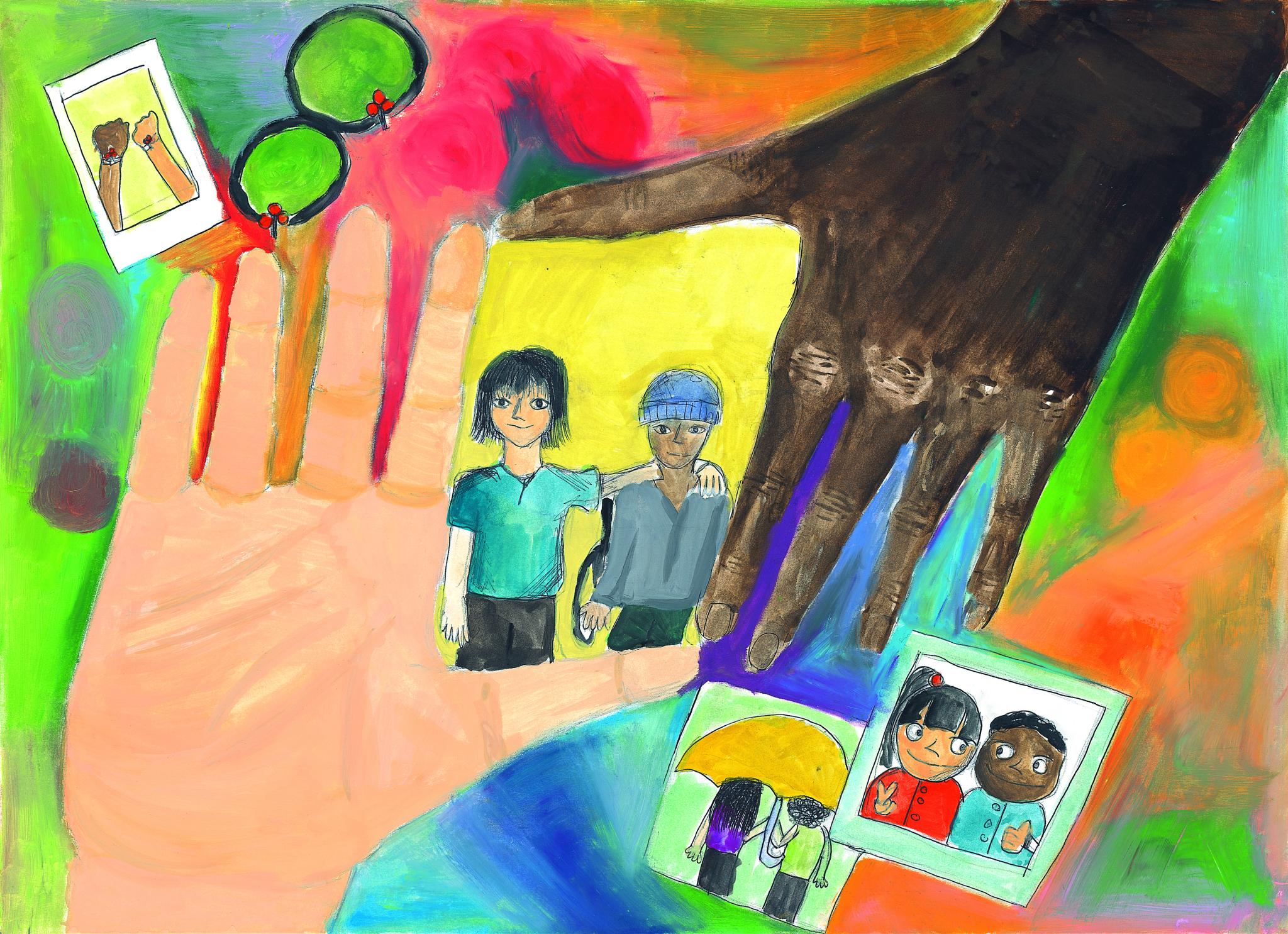 아픈 친구와 피부색이 다른 친구 누구든 멋진 친구를 사귈 수 있습니다! 친구와 같이 우산 쓰고 친구와 같이 팔찌 차고 우리 멋진 친구야. 서로서로 도와주는 친구.