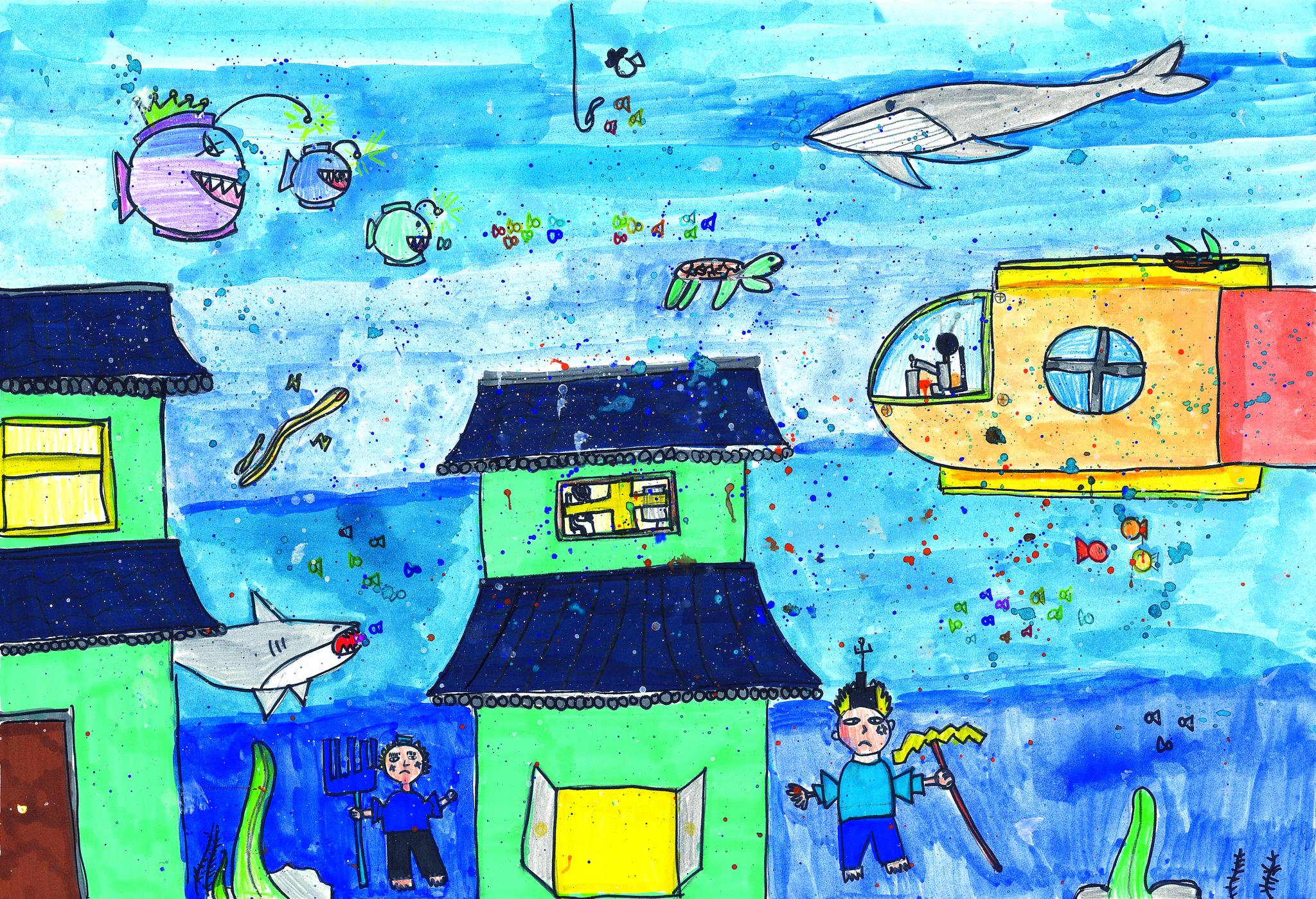 제가 상상한 바닷속에 한 로봇이 탄 잠수함이 와, 용궁을 발견해 아름다운 바다를 봅니다.