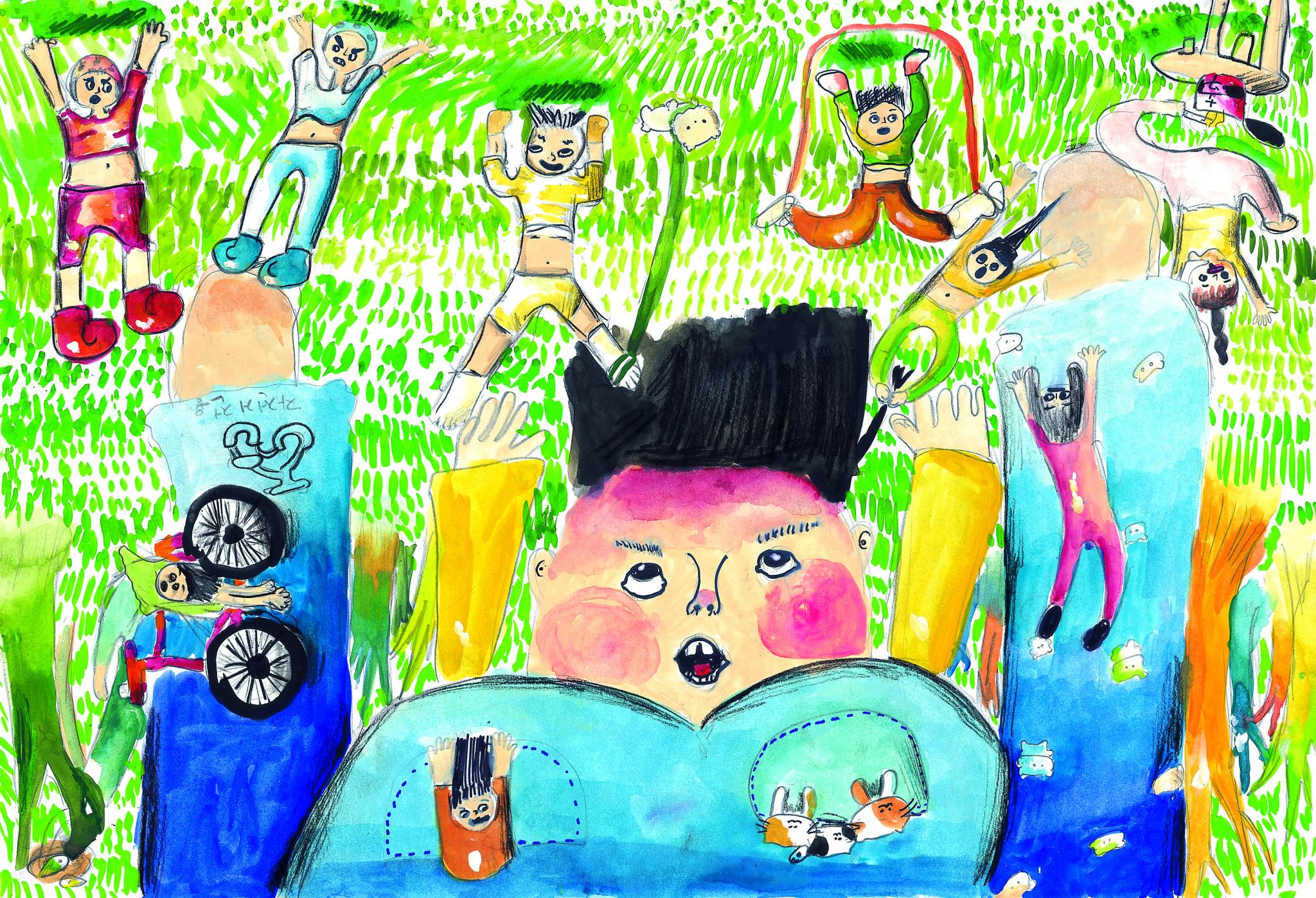 앞구르기를 하려는 그 찰나에, 세상이 거꾸로 되었다. 바닥이 천장이 되고, 천장이 바닥이 되었다. 친구들도 박쥐처럼 천장에 붙어있었다. 나는 그게 신기해서 그림으로 표현해 보았다.