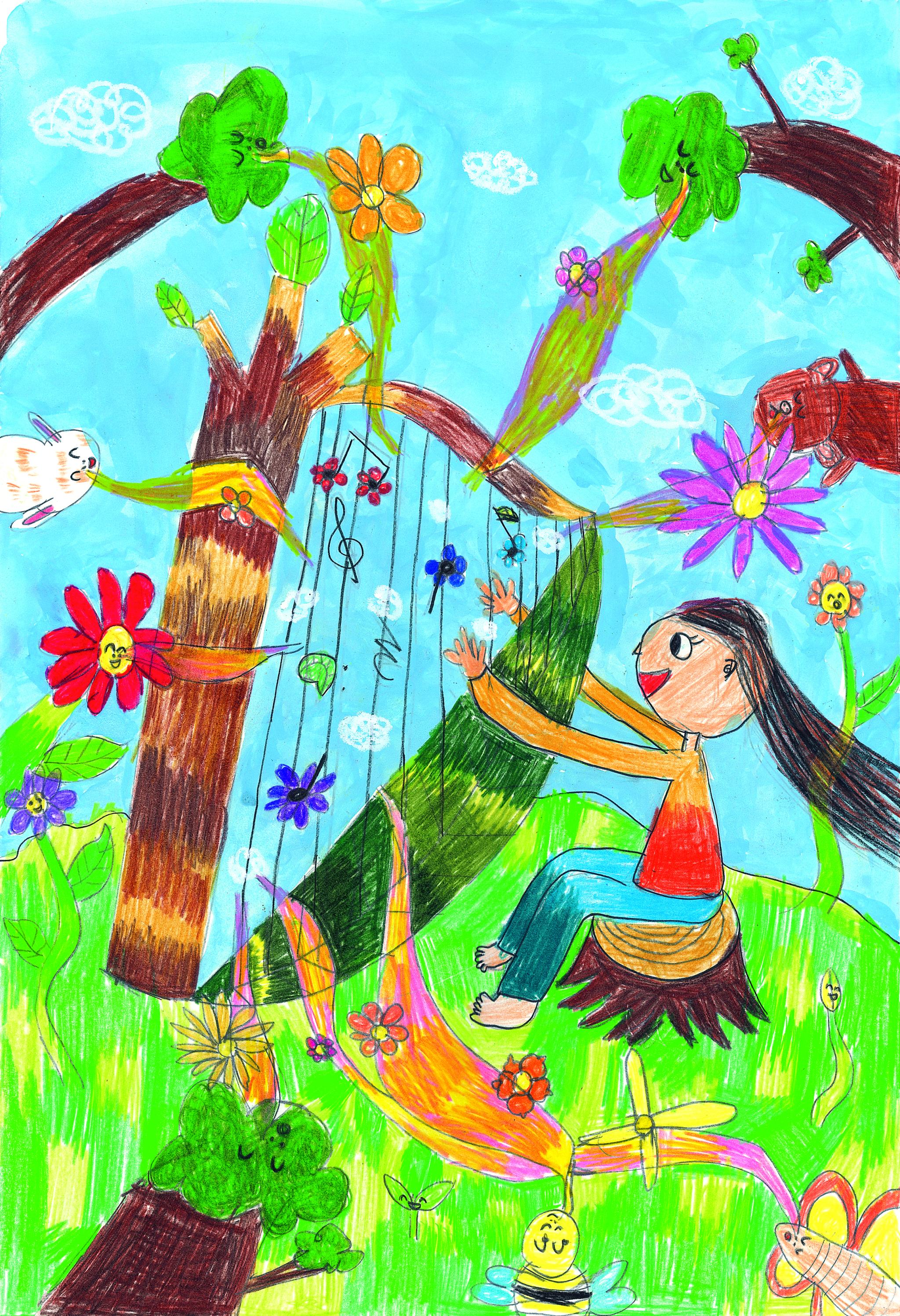 나무로 만든 하프로 연주하며, 식물과 동물들에게 좋은 향기와 음악을 들려주는 작품입니다.