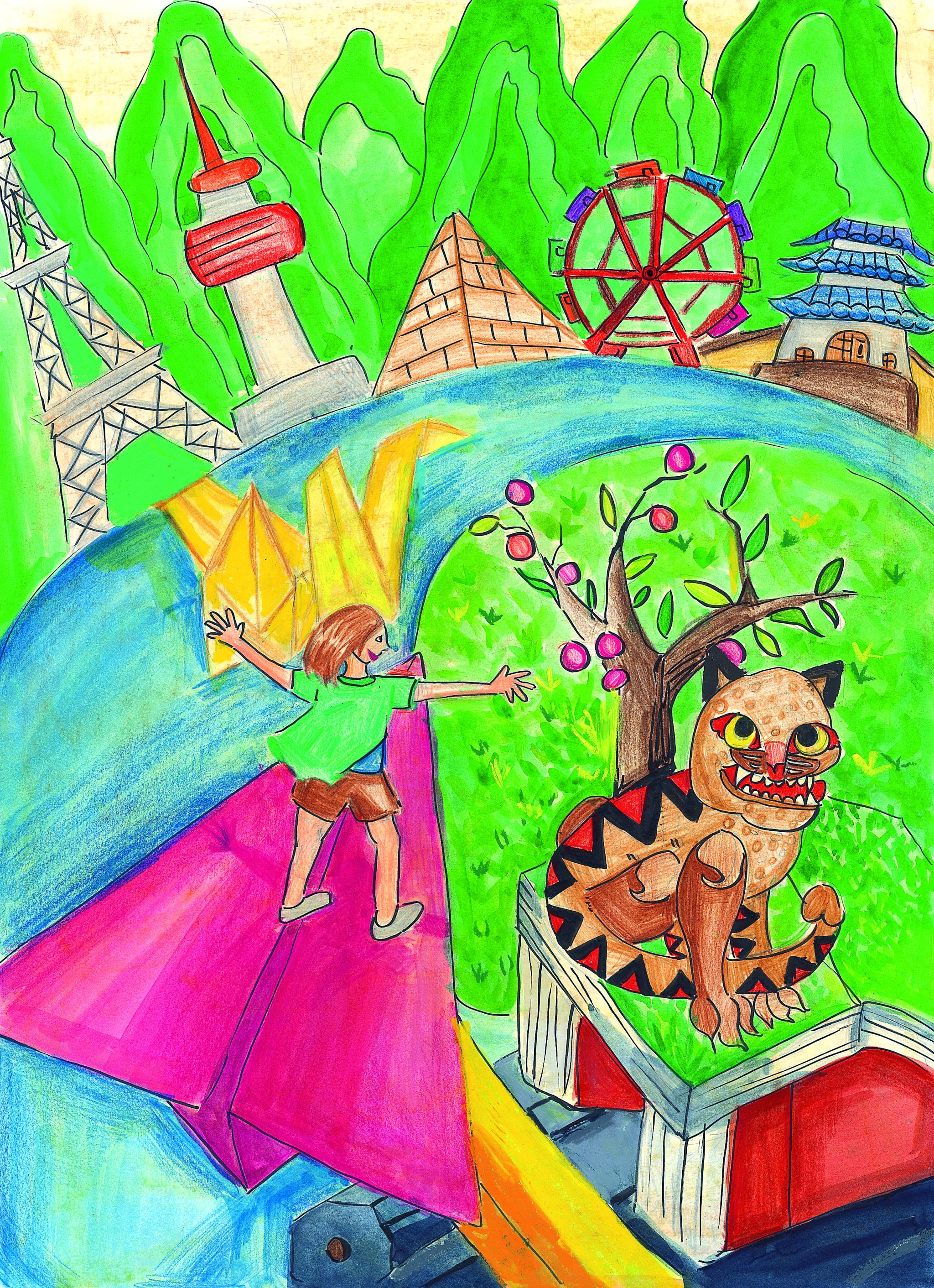 종이학은 희망과 평화, 위로의 뜻이 있어요. 복숭아나무는 사랑과 결실의 의미를 담고 있지요. 우리가 살아갈 미래에 간절히 필요한 건, 치열한 경쟁과 날선 전쟁이 아닌, 따뜻한 위로와 사랑입니다. 한국 호랑이의 용맹함을 닮아 세상을 품는 저와, 세계의 모습을 상상하여 그려보았습니다.