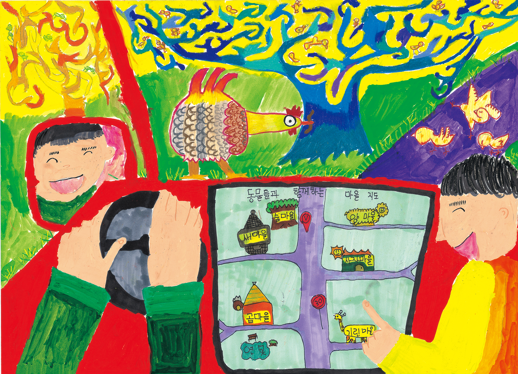 새들이 옹기종기 모여있는 새마을에 내비게이션으로 찾아가는 길에 사자마을, 양마을, 기린마을, 곰마을, 새마을, 숲마을을 지나가고 있어요. 숲마을에 가보니 신비한 나무위에 새들이 옹기종기 있었어요.