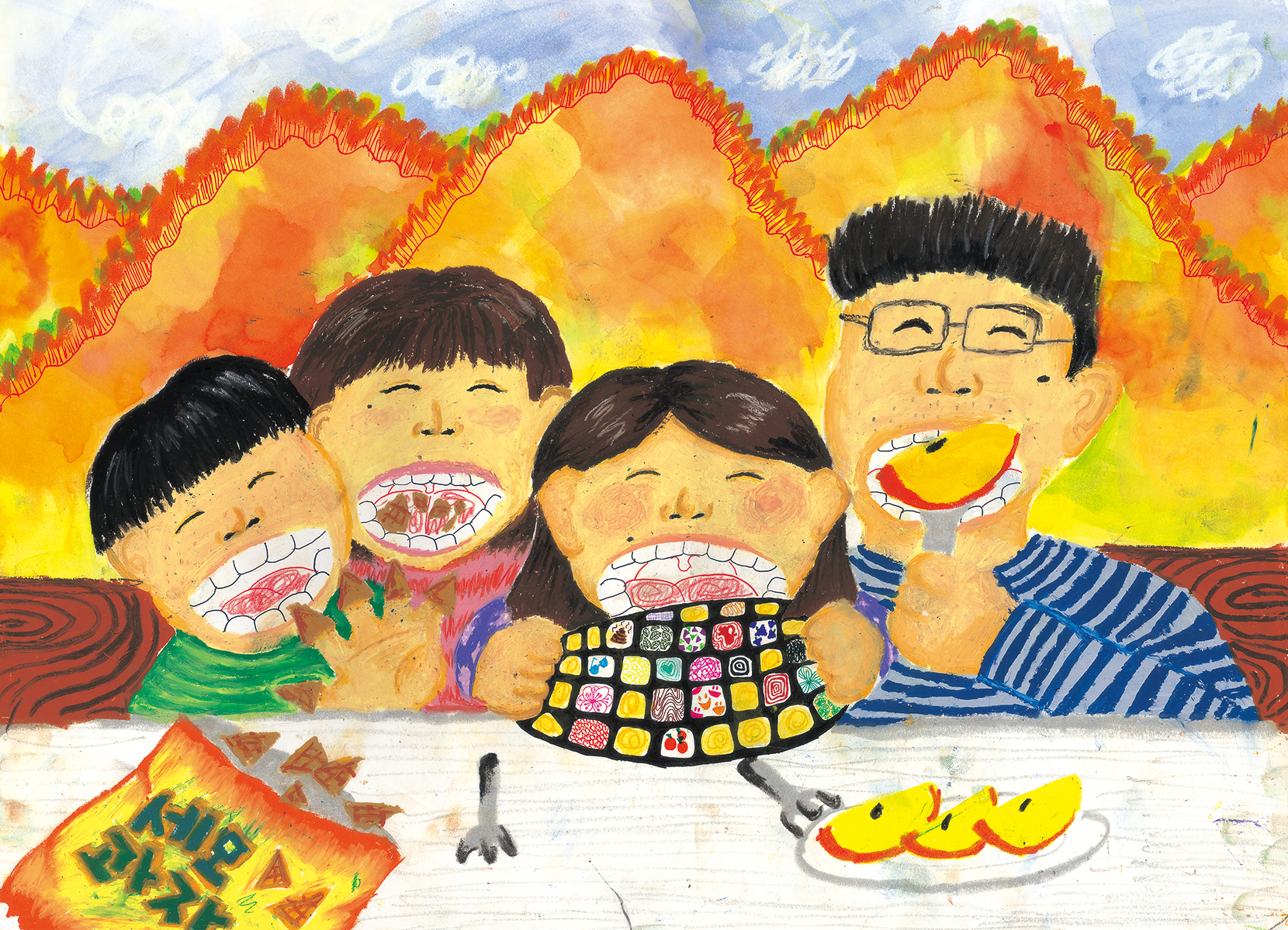 저는 가족들과 옹기종기 모여서 맛있는 간식을 먹는 걸 좋아해요 제가 좋아하는 옥수수를 먹는 장면과 가족들이 하하호호 웃는 모습을 그려봤어요 우리가족 행복해보이죠!