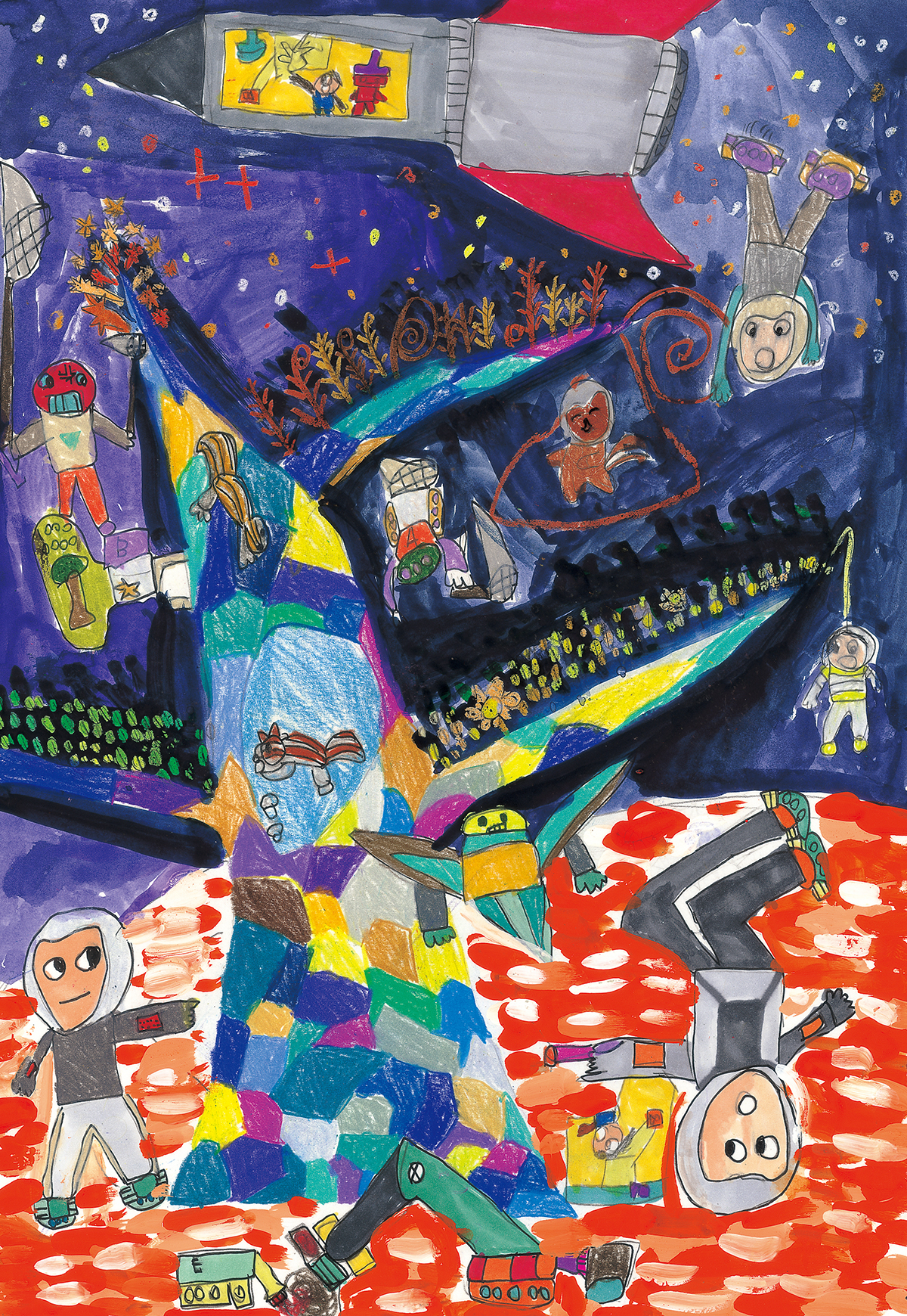 화성에서 커다랗고 신기한 나무를 발견했어요. 다람쥐와 로봇들이 나무에서 놀고 있고 나와 누나는 나무를 보며 즐거워하며 손목 전화기로 우주선에 있는 엄마와 전화하고 있어요.