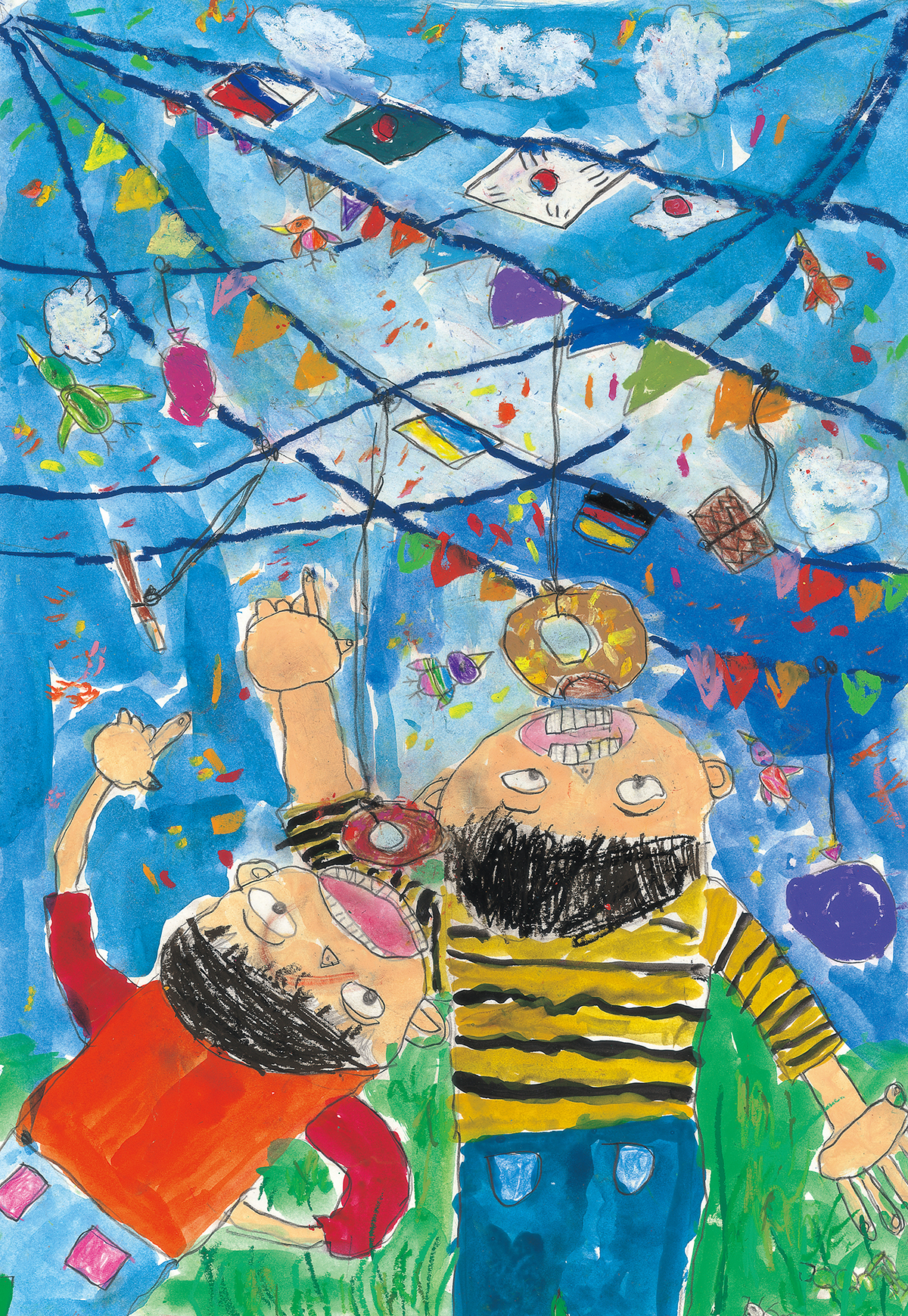 체육대회에서 옹기종기 와글와글 과자따먹기 시합을 하는 모습