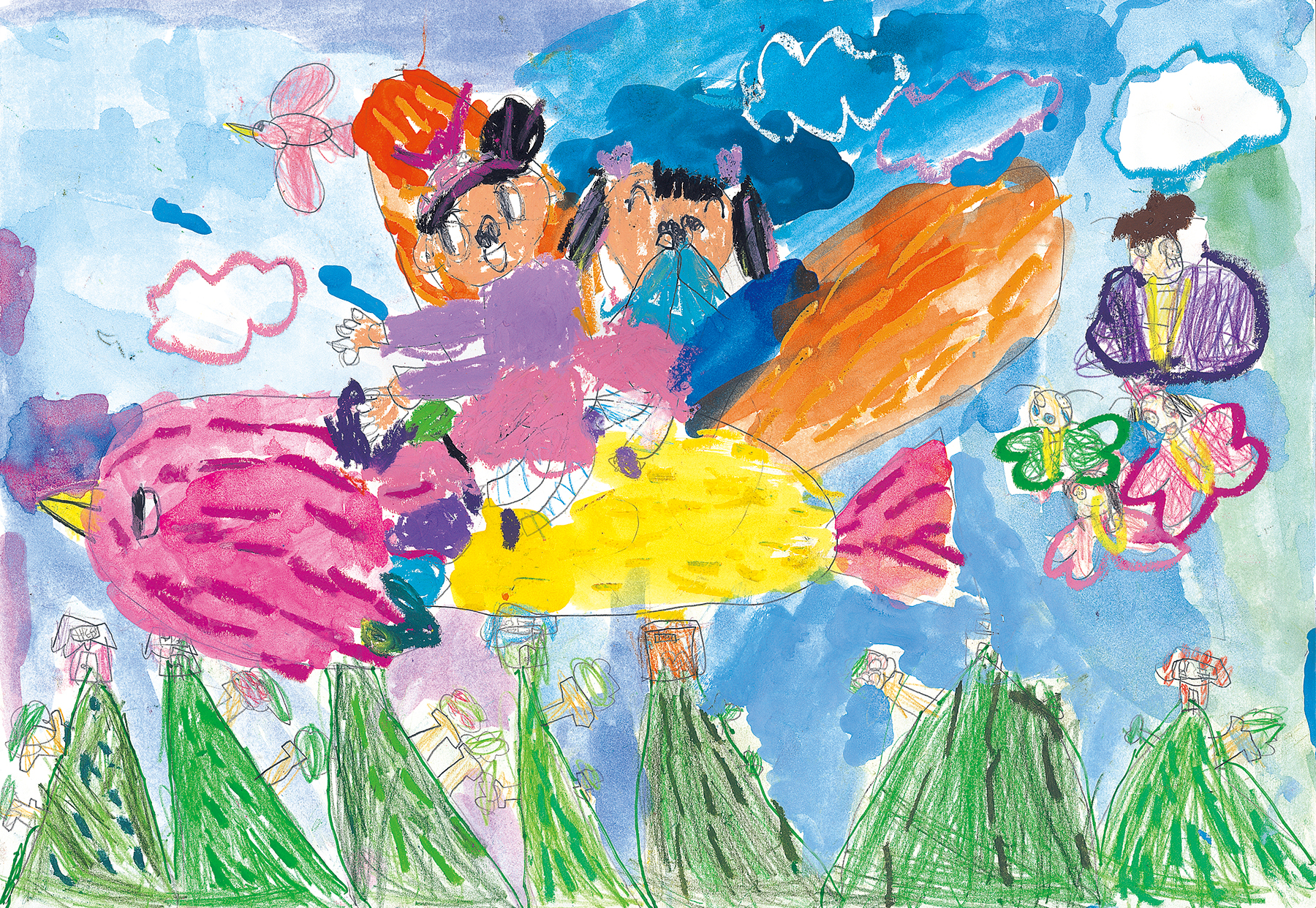 커다란 독수리를 타고 친구와 하늘을 나는 나! 산 아래는 다른 나라도 있고, 가게랑 호텔도 있어요. 아기독수리와 나비 가족들이 인사하고 있어요!