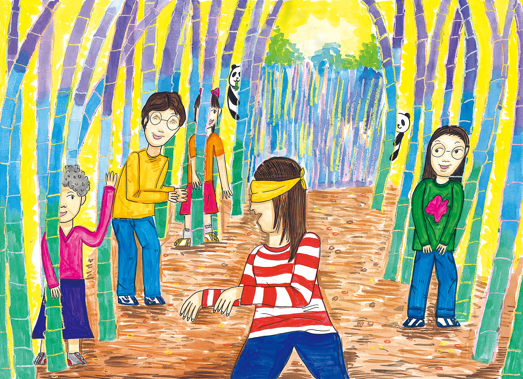 온가족이 함께 대나무숲에서 즐거운 눈가리기 놀이를 해요. 가족이 함께라면 웃음꽃이 피어요.