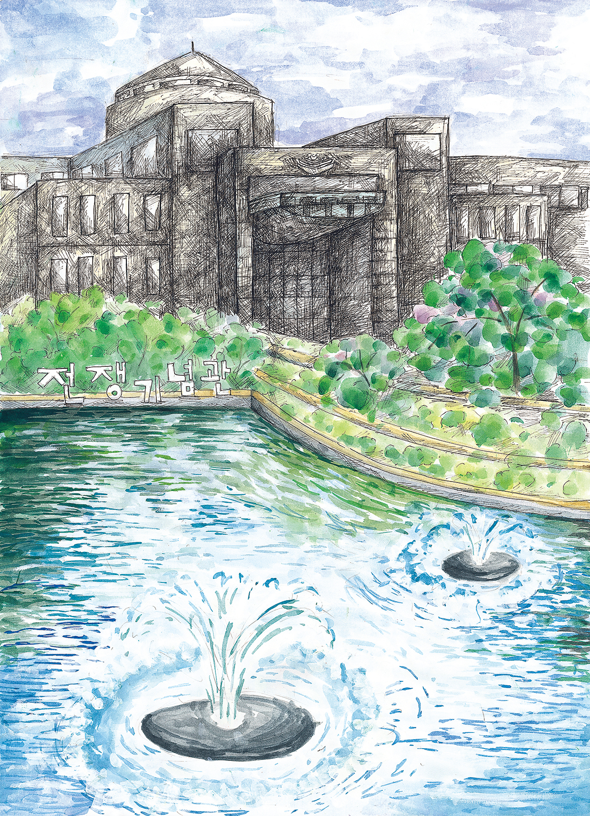 "전쟁의 기록과 열기가 담겨있는 전쟁기념관과 그 속의 전쟁의 열기가 현재 우리의 일상 속에서 풀, 나무, 물의 조화로움 같은 평화로 남아 우리의 시너지와 에너지가 되는 모습을 담은 작품입니다."