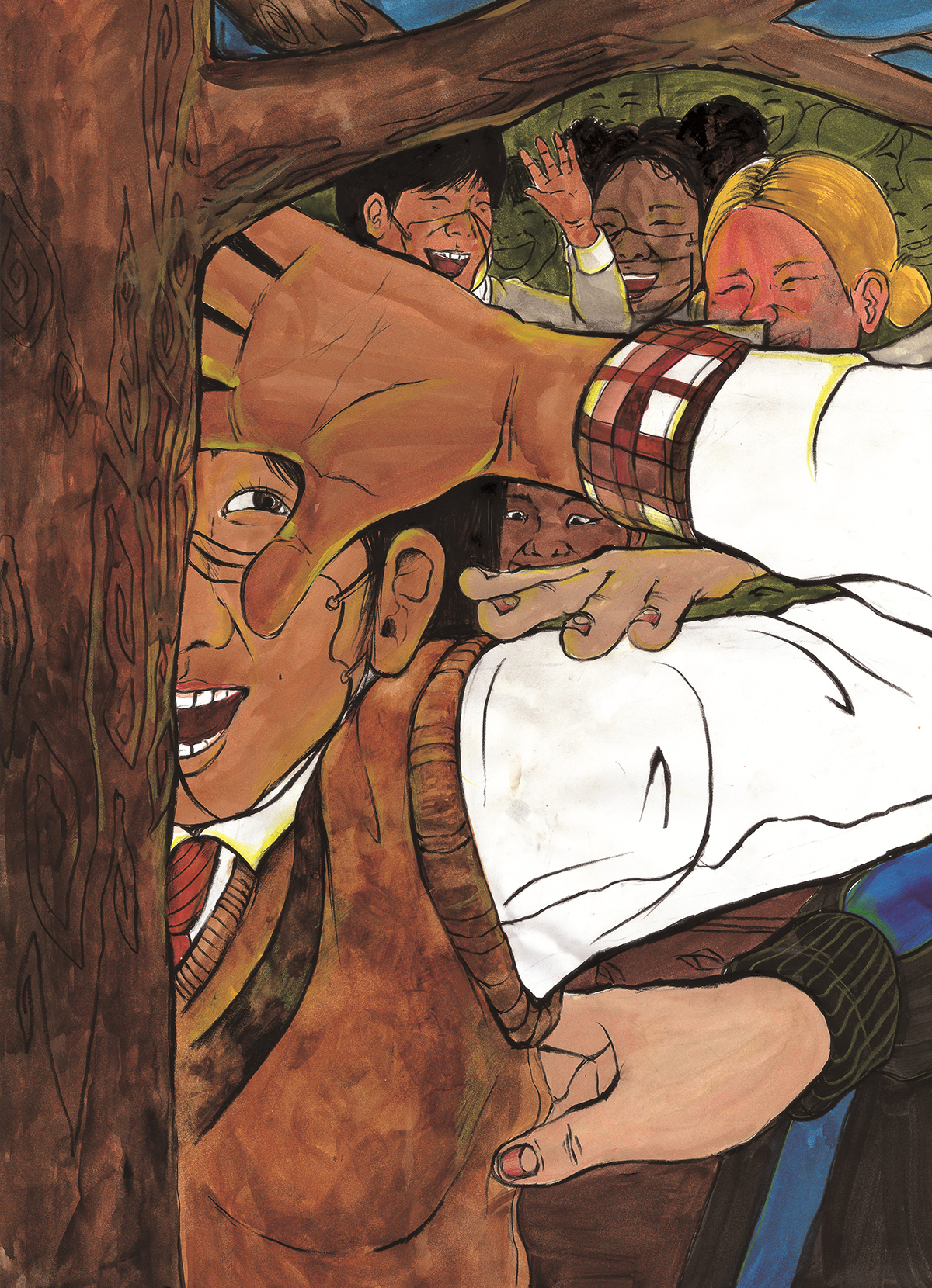 화목하게 어울리다라는 뜻을 가진 화합을 그려냈습니다. 작품 속 인물들에게 조금씩 걸쳐진 노란 빛은 작품 제목, 든해에 든 뜻을 표현하기 위함입니다.