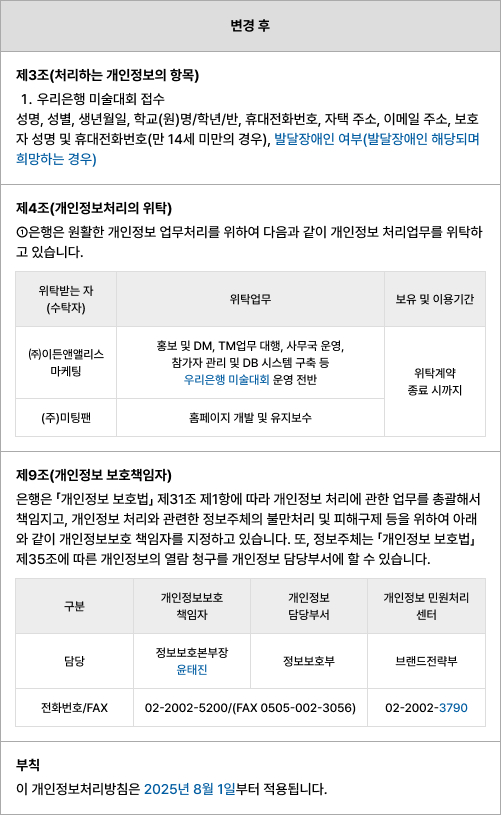 - ①정보주체는 은행 또는 우리은행 우리미술대회 인터넷 홈페이지(www.woorimisul.com)를 통해 은행이 처리하는 자신 및 만 14세 미만 아동(법정대리인만 해당)의 개인정보 열람 및