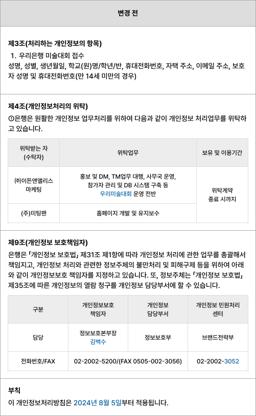 - 2.우리은행 미술대회 단체접수 : 전시회가 종료된 날로부터 5일까지 보유·이용
