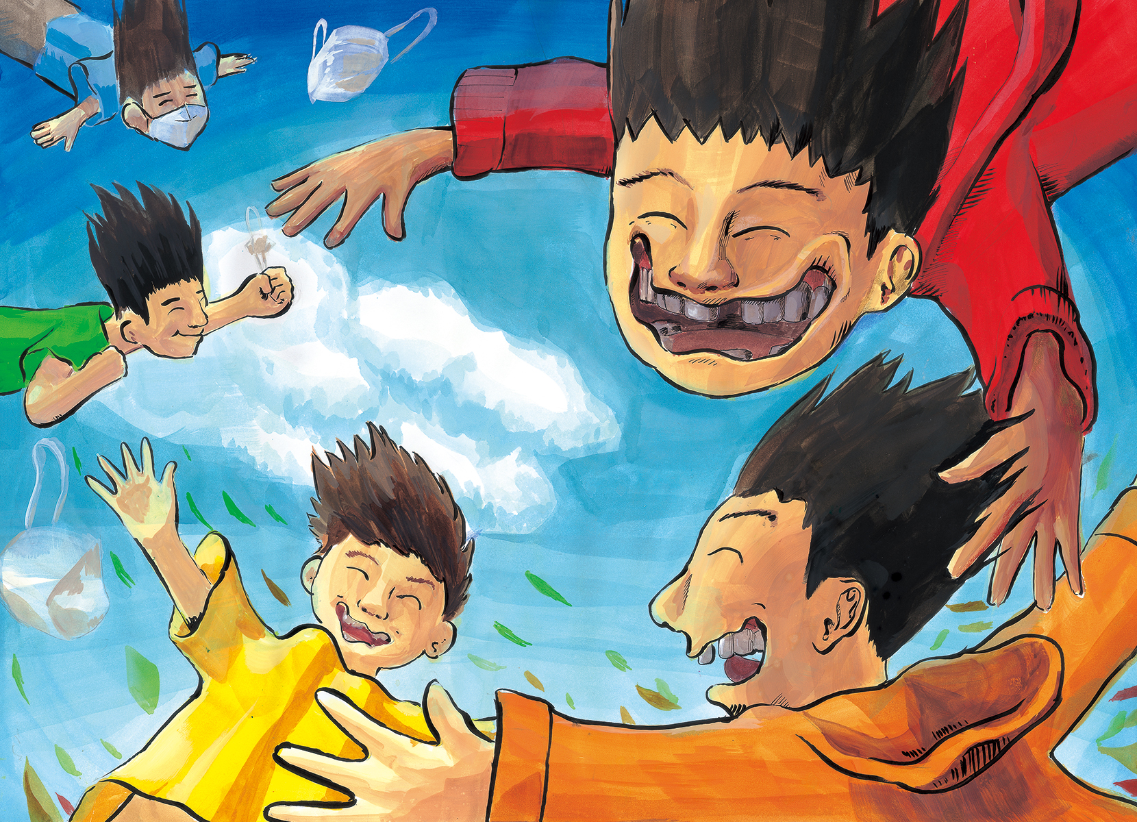 현재의 나는 마스크를 끼고 혼자 외롭게 있지만 미래에는 코로나가 끝나고 우리 모두는 마스크를 벗고 활짝 웃으며 행복해 할 것이다.