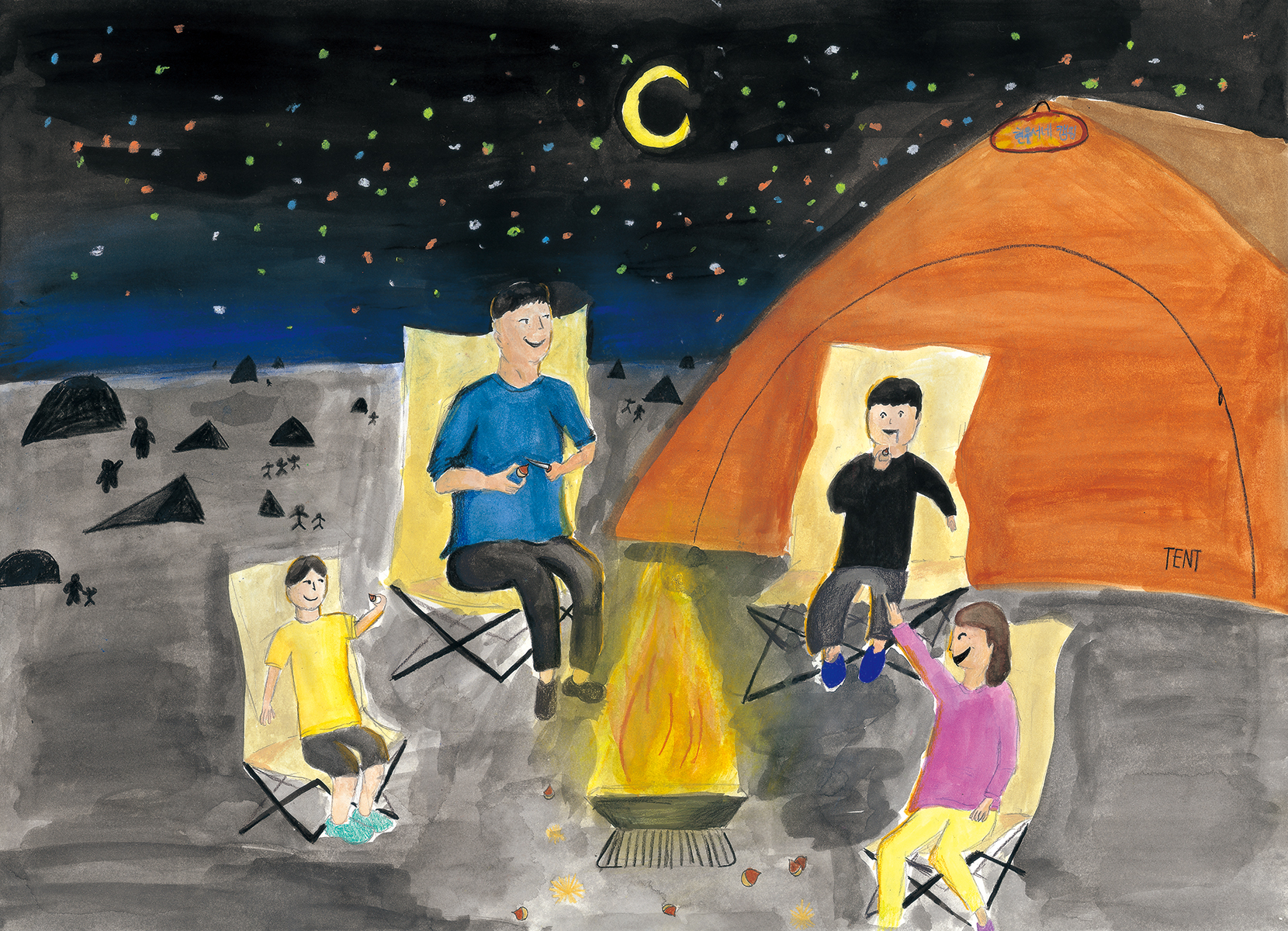 가족들과 함께 즐겁게 캠핑을 가는 것은 저에게 큰 행복입니다. 그 순간의 분위기와 냄새는 추억으로 남아 저에게 즐거움이 되어줍니다. 캠핑에서 즐겼던 추억의 냄새와 행복한 만큼 또 캠핑에 가고싶은 제 마음을 담아 이 작품을 그렸습니다.