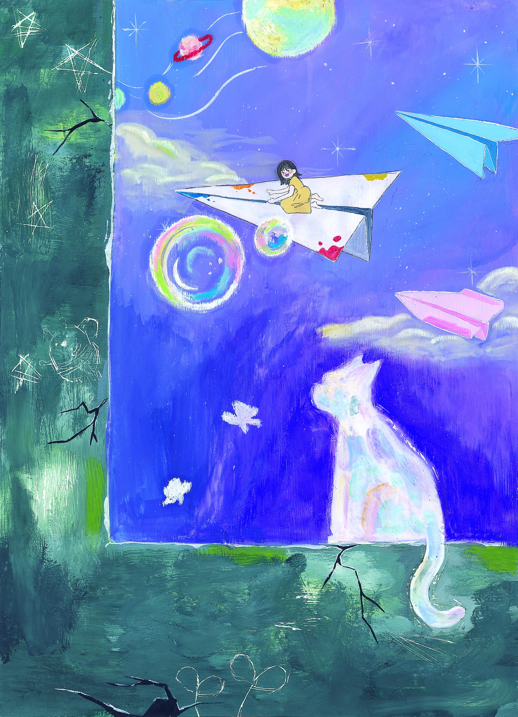 세상은 정해진 틀과 규칙대로 나를 평가하려 합니다. 하지만 저는 저의 상상과 바람, 소중한 것들을 마음에 가득 품고 세상에 제 에너지를 발산하고 싶습니다. 벽과 그 너머의 상상의 세상을 그려, 세상의 틀에 갇히지 않고 벽 너머 상상의 세상으로 나아가고자 하는 의지를 표현하였습니다. 언젠가 저만의 상상의 힘으로 세상을 더욱 즐겁게 살아가고 싶습니다.