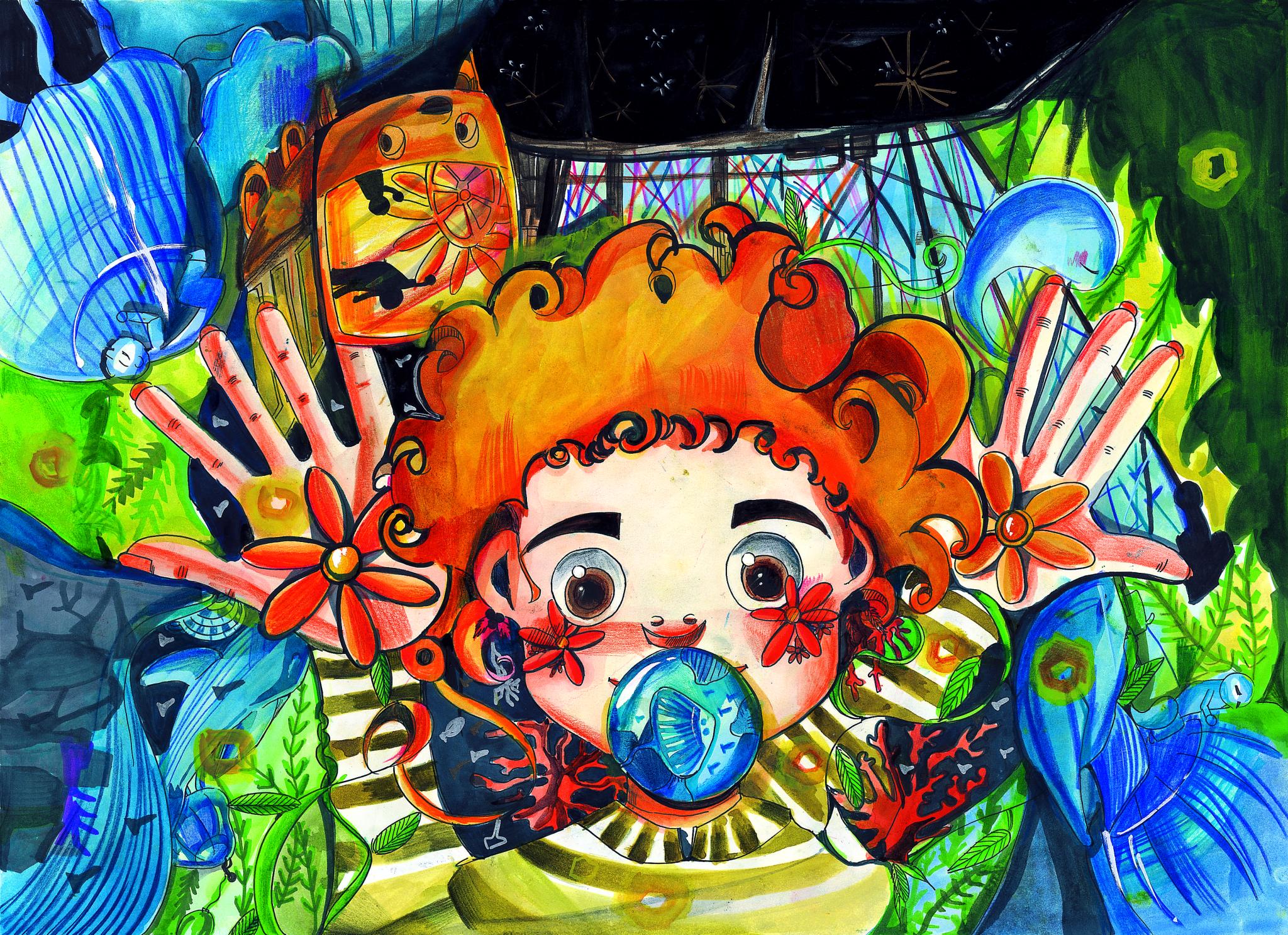 사람들의(우리의 한 켠), 마음속 한 켠에는 각각 자신의 어린 시절의 기억을 하나씩 지니고 있을 겁니다. 이 그림은 어린 시절 속 저의 추억과도 같은 장소를 상상하며 그렸습니다. 어린 시절 가족들과 놀이공원에 갔던 경험, 계곡에서 신나게 놀았던 경험이 저의 마음속 한 켠에 있었습니다. 또한 사람들은 어릴 적 자신이 갔던 곳을 회상하거나 상상하기도 합니다. 그런 모습을 그림 속 소녀가 보여 주고 있습니다. 소녀가 물고 있는 물방울은 바닷속 물방울을 꺼내 풍선껌처럼 물고 있는 모습입니다. 이것 또한 소녀가 어릴 적 문방구에서 사 먹던 500원짜리 풍선껌을 의미합니다. 소녀는 거꾸로의 모습으로 활짝 웃고 있는데, 이는 자신이 어린 시절에 장난쳤었던 개구쟁이의 모습을 나타내었습니다. 이 모습은 저의 어린 시절의 모습과 유사하며, 호기심 많고 활발했던 저의 모습을 그렸습니다.