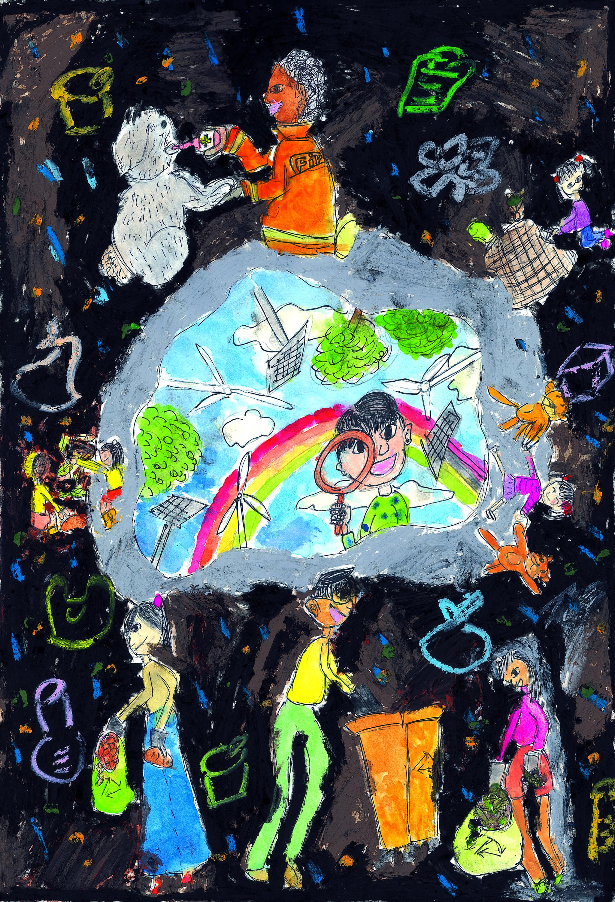 저는 오염된 지구를 보석처럼 생각하는 사람들이 한마음으로 지구를 반듯하고 깨끗하게 만드는 모습을 그렸어요. 굴속을 들여다보는 아이는 청소하고 지구를 돕는 사람들한테서 본받을 것이 많다는 것을 깨달았는데, 이 마음을 우리도 느끼면 좋겠다고 생각하며 그렸어요. 굴 밖에는 나무와 풍력 발전기, 태양열 발전기가 있는데 그것보다는 굴 속 사람들의 마음이 더 중요하다는 알리고 싶고 지구를 진심으로 위하는 사람들이 우리 곁에 더 많아졌으면 좋겠어요.