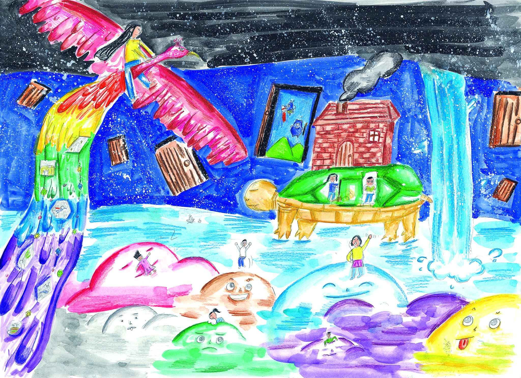 주인공인 '나'는 내가 하는 모든 상상 보석이 꼬리에 길게 늘어진 멋있는 새를 타고 있다. 그 밑에는 살아있는 구름들과 그 위에서 노는 아이들이 있다. 폭포수로 만들어진 강 위로는 물 위를 떠다니는 거북이가 오두막집을 업은 채 물 위를 걷고 있다. 절벽에는 또 다른 세계로 가는 문들이 있는데 그중에 아트콘으로 가는 문도 있다. 나는 멀미가 심해서 이렇게 문을 열면 바로 갈 수 있는 세계를 자주 상상해서 오늘 이렇게 표현해 보았다. 지금은 새를 타고 '아트콘 세상'으로 가서 그림을 완성할 것이다.
