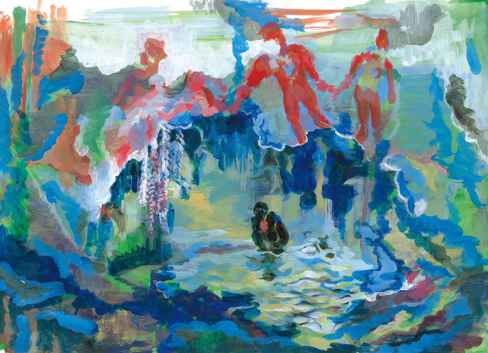 이 작품에 "오늘의 나, 내일의 우리" 라는 주제를 사용하였습니다. 우리가 현재에 경험중인 일들과 미래, 혹은 과거에 자신이 경험하지 못한 일들을 경험한 것 처럼 이해하는 것은 어려운 일입니다. 하지만 우리가 타인과 화합하기 위해선 이와 같은 사고방식이 요구되곤 하고, 이 그림속엔 뚜렷하고 진한 색깔의 한 사람과 은은하고 흔들리는 모습으로 그려진 여러 사람들이 있습니다. 개인의 경험을 의미하는 풍경속에서 은은하고 흐릿하게, 유영하는 사람들은 그림속 풍경을 돌아다니며 한 사람만이 있던 풍경에 색채와 발자국을 보입니다. 그리고 저 풍성한 풍경이 됩니다. 그림처럼 우리는 살아가며 다양한 체험을 하며 풍경을 남기고 꾸려갑니다. 그리고 차주, 혼자 남긴 풍경보다 타인과 함께 만든 가치관이 더 아름다운 세상을 만들곤 합니다. 우리가 화합하기 위해서 다른 사람을 바꾸기보단 다른사람의 흔적을 인정해야 합니다. 그런 희망 사항을 그림으로 표현하여 이상적인 풍경을 형상화 하였습니다.