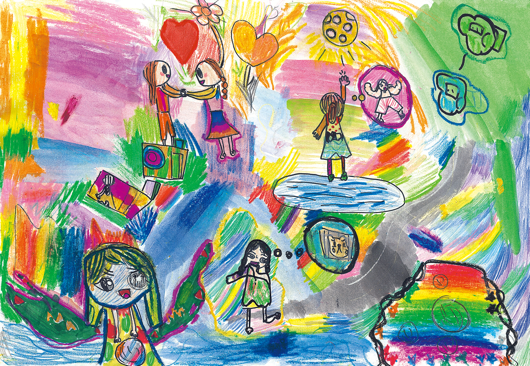 내가 가진 무지개색깔 파워구슬을 담아 항아리에 저장하고 친구들에게 힘을 나눠주어 행복해하는 모습을 표현했습니다.
