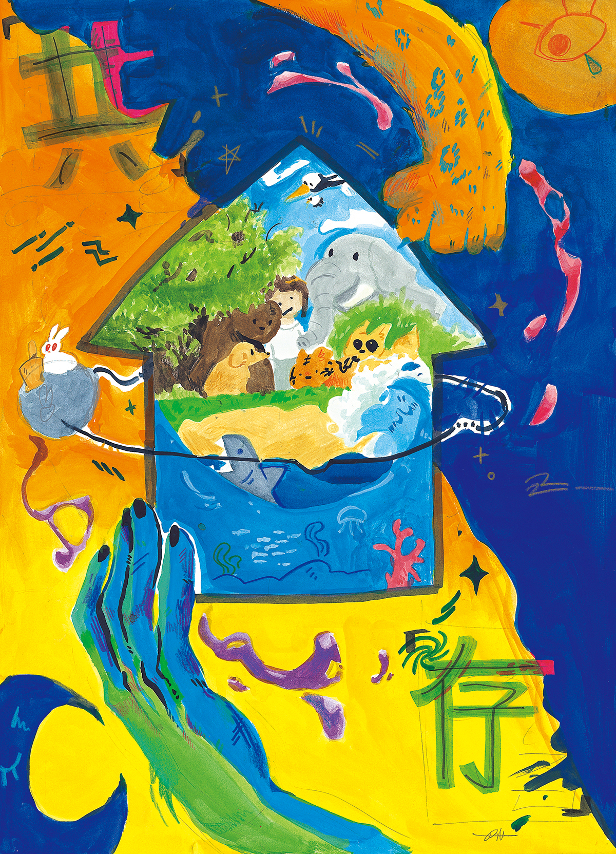 이 그림의 전체적인 배경은 양과 음이 나뉜 우주입니다. 그리고 중간의 집은 지구를 나타내는데, 이때 지구에서 보이는 조그만 인간은 세상에는 너무 많은 생명체가 같이 공존하기에 우주에게는 아무것도 아니게 됩니다. 그리고 위, 아래의 손과 동물의 발은 우리 인간과 다른 생명은 어쩔 수 없이 같이 존재하게 된다는 것을 뜻합니다. 읽어주셔서 감사합니다!!